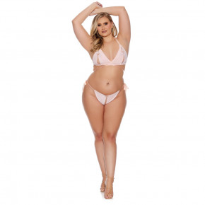 Roze satijnen stropdassen en strikken sieren deze plus size bralette en slip set met sexy bindbandjes op de heupen en rug.